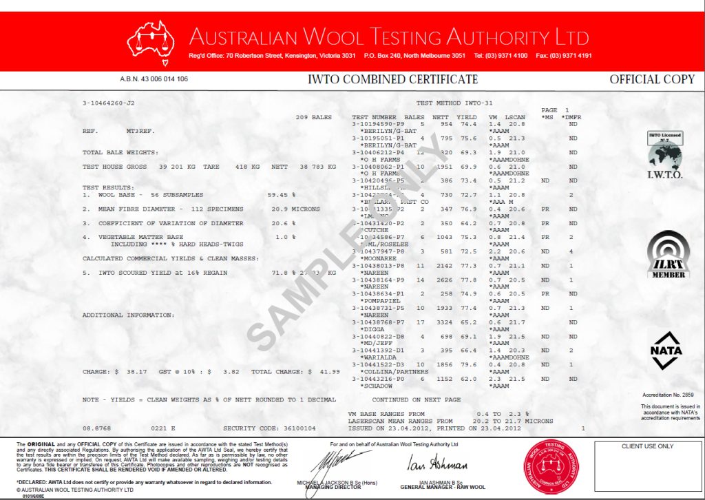 Wool Exporters and processors are required by purchasers to provide test certificates that show that a consignment of wool meet the requirements specified in a contract. These documents are also used to authorise payments by banks issuing letters of credit. Consignments often consist of numerous sale lots purchased according to the contract specifications. As it is not cost effective for the individual sale lots to be resampled and measured again as a single test, AWTA provides a service where the tests results of individual sale lots can be arithmetically combined to show the overall average measurements on a single IWTO Combined Certificate. These IWTO Combined Certificates are widely recognised and trusted throughout the wool supply chain. Similarly, the same process can be used to produce Objectively Matched Lots, however the combination of lots is restricted by minimum and maximum measurement ranges.