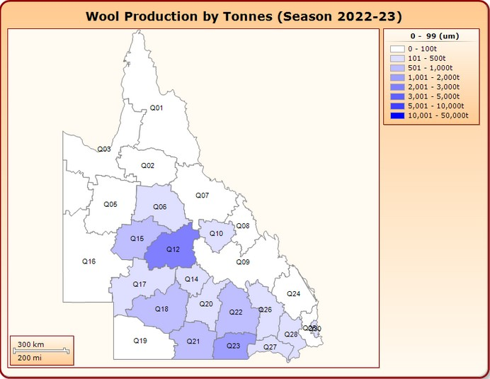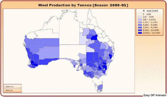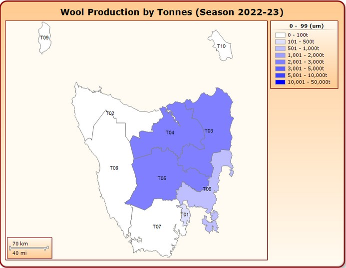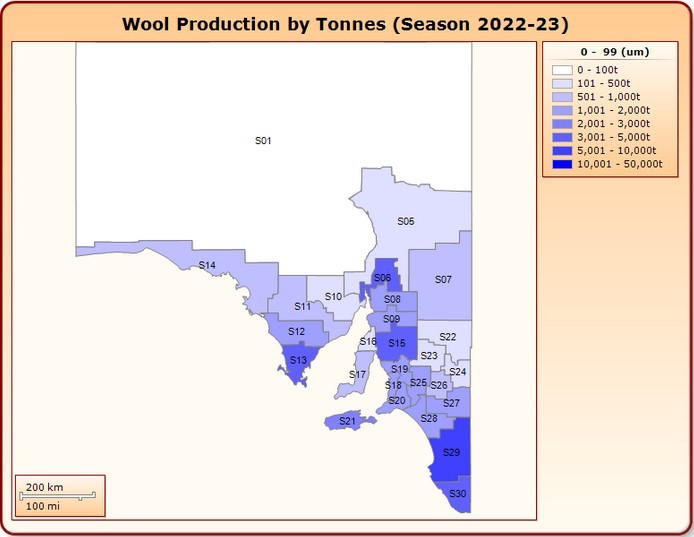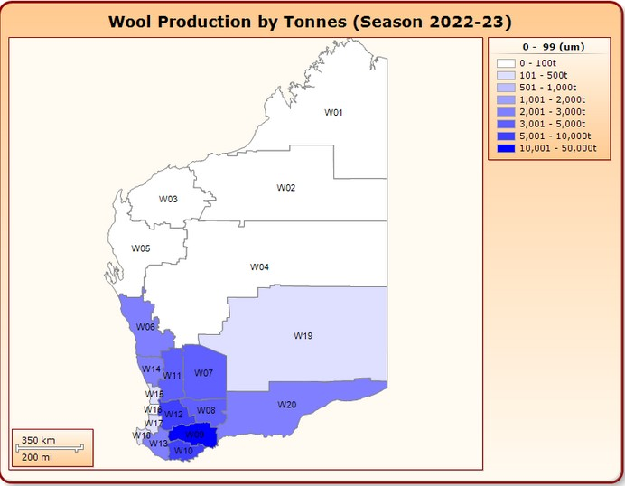 下面的地圖顯示了上一季各州 WSA 經測試的羊毛產量。顏色刻度用於顯示每個地區羊毛產量的相對變化;顏色越深,羊毛量越大。