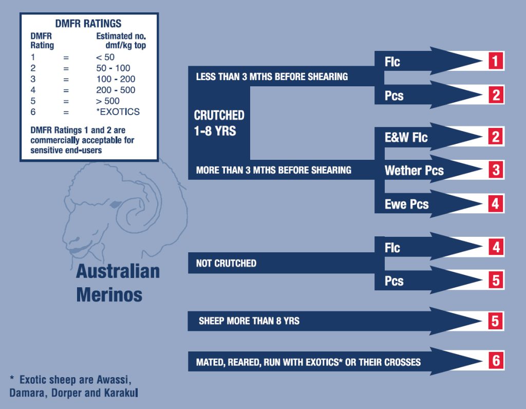 The International Wool Textile Organisation (IWTO), through its Australian affiliate, Wool Industries Australia (WIA), advocates to protect the reputation of Australia’s premium Merino white wool by managing the risk of dark and/or medullated fibre (DMF) contamination. The program operates through voluntary declarations made by wool growers on the classers specification that accompanies wool deliveries to selling agents stores and brokers warehouses. This information is forwarded to AWTA who calculate the Dark and Medullated Fibre Risk (DMFR) rating and report in on the Yield & Micron test certificate. The DMFR rating is then displayed in sale catalogues so that buyers can make informed purchases.