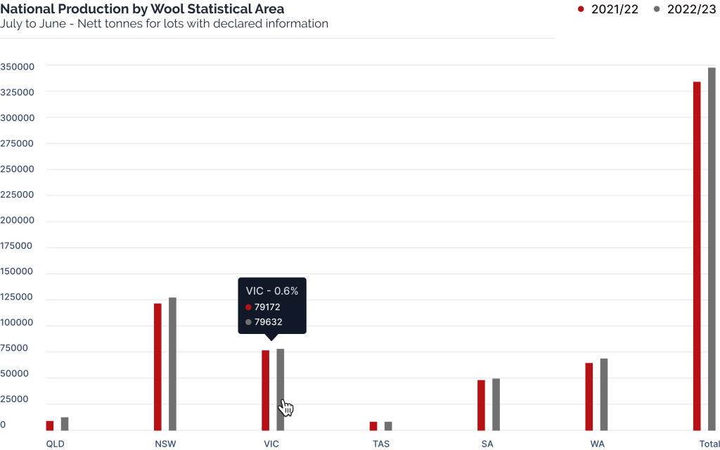 The following charts show the volume of wool tested from each State for the current and previous selling seasons across each Wool Statistical Area (WSA) and the % change from season to season.